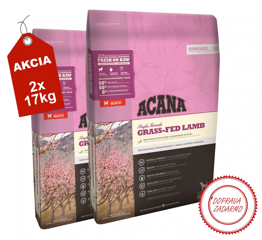 ACANA Grass-Fed Lamb je monoproteínové krmivo pre citlivé psy všetkých plemien a veľkostí. Krmivo obsahuje 50% jahňacieho mäsa z voľného chovu a 50% ovocia, zeleniny a bylín.