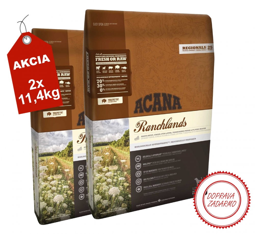 čerstvé hovädzie Angus 8%, surové jahňacie 7%, čerstvé bravčové 7%, dehydrované hovädzie mäso 7%, dehydrované jahňacie mäso 7%, dehydrované bravčové mäso 7%, celý zelený hrach, celá červená šošovica, celý cícer, hovädzí tuk 5%, čerstvá hovädzia pečeň 4%, čerstvý bizón 4%, čerstvý zubáč 4%, celá zelená šošovica, celá fazuľa pinto, celý žltý hrach, na slnku sušená lucerna, čerstvé hovädzie ľadviny 2%, olej z tersky 2%, vláknina zo šošovice, sušené hovädzie chrupavky 1%, surové jahňacie držky 1%, sušená morská riasa, čerstvá tekvica, čerstvá maslová tekvica, čerstvý paštrnák, čerstvá kapusta, čerstvý špenát, čerstvé listy horčice, čerstvé listy kvaky, čerstvá mrkva, čerstvé jablká red delicious, čerstvé hrušky bartlett, mrazom sušená pečeň (hovädzia, jahňacia, bravčová) 0,1%, čerstvé brusnice, čerstvé čučoriedky, koreň čakanky, kurkuma, ostropestrec, koreň lopúcha, levanduľa, koreň ibišku, šípky