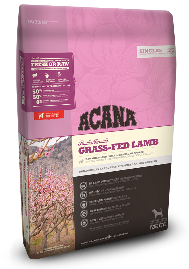 ACANA Grass-Fed Lamb je monoproteínové krmivo pre citlivé psy všetkých plemien a veľkostí. Krmivo obsahuje 50% jahňacieho mäsa z voľného chovu a 50% ovocia, zeleniny a bylín.