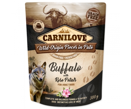 Kompletné krmivo pre psov s lahodnými kúskami mäsa v paštéte. Kapsička obsahuje byvolie mäso a plátky ruží. Bez obilnín, zemiakov, GMO, sóje a konzervantov.