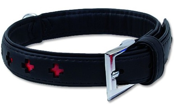 • Krásny čierny koženkový obojok zdobený červenými krížikmi.