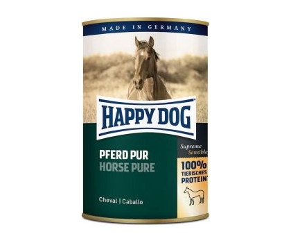 Vlhké kompletné krmivo pre psov HAPPY DOG Pferd Pur sa vyrába výhradne z čerstvého mäsa a vnútorností koní, a je obohatené o životne nevyhnutné vitamíny a minerálne látky. Konzerva neobsahuje žiadne rastlinné prísady. A zaručene neobsahuje žiadnu sóju, žiadne umelé farbivá a žiadne konzervačné látky.