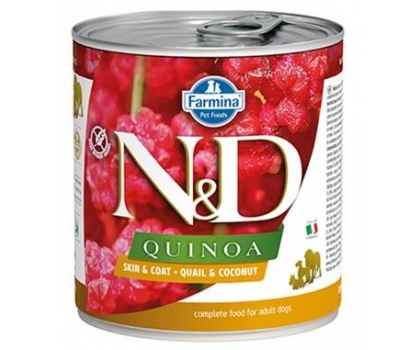 Farmina N&D Dog Quinoa Quail & Coconut je kompletné diétne krmivo pre psy, odporúčané na zníženie neznášanlivosti voči zložkám a živinám krmív.