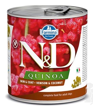 Farmina N&D Dog Quinoa Venison & Coconut je kompletné diétne krmivo pre psy, odporúčané na zníženie neznášanlivosti voči zložkám a živinám krmív.
