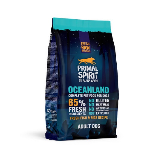 V krmive Primal Spirit Oceanland sa nachádza 65% celých čerstvých atlantických rýb (stavrida, makrela, sardínka a losos) a čerstvého kuracieho mäsa z voľného chovu v oblasti Andalúzie. Na výrobu 1kg granúl Primal Spirit Oceanland sa tak použije až 2,2kg čerstvých rýb a mäsa. Primal Spirit používa rovnako čerstvé suroviny ako jeho vyššia rada krmív Alpha Spirit.