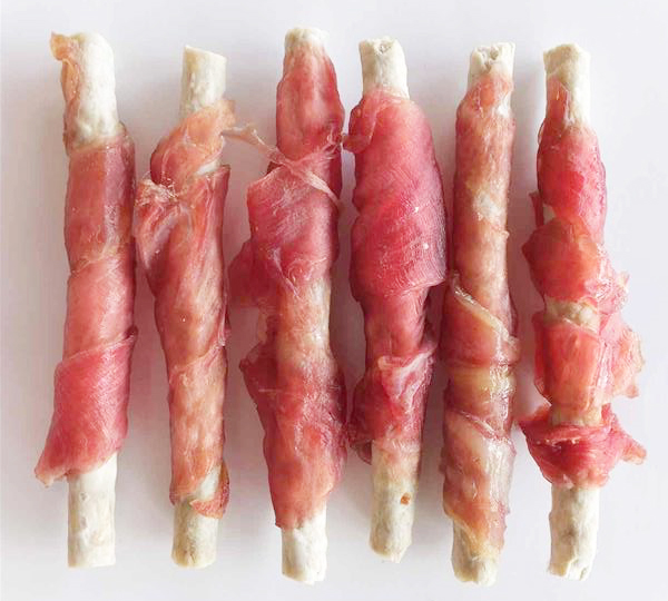 Zloženie: králičie mäso 65%, byvolia koža 30%, rastlinný proteín 3%, glycerín 1%, soľ 1%.