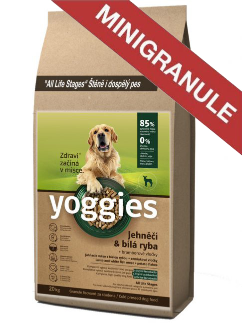 Pre psy malých plemien, ako aj štěňatá stráviacimi problémami, alebo otylých psíkov sme pripravili tieto minigranule s jahňacím mäsom a bielou rybou. Sú to granulky diétniejšie s ca 24,5% proteínov a 9,5% tukov získaným priamo z mäsa (žiadné pridávané tuky apod.) ako ostatné typy granúl Yoggies.